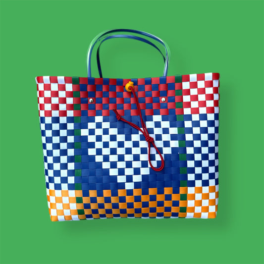 Bicycle Pannier recycled white blue red plastic woven basket tote bag