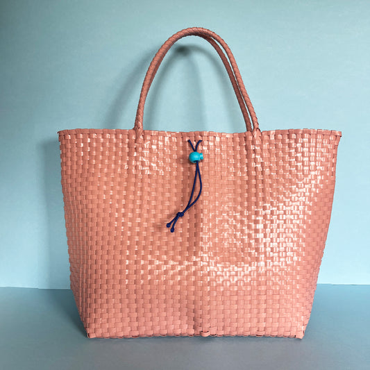 Bicycle Pannier recycled Peach plastic woven basket tote bag with toggle closure