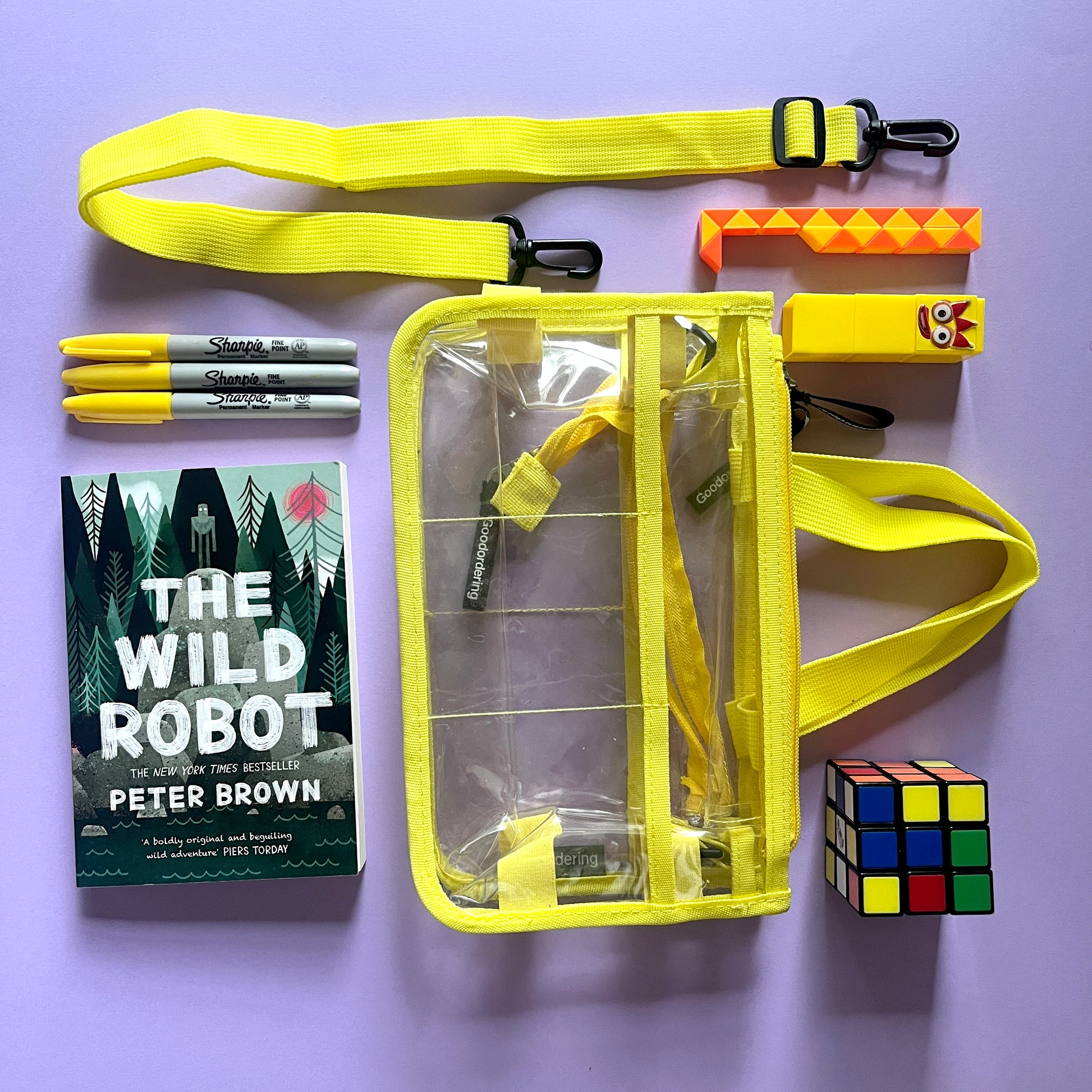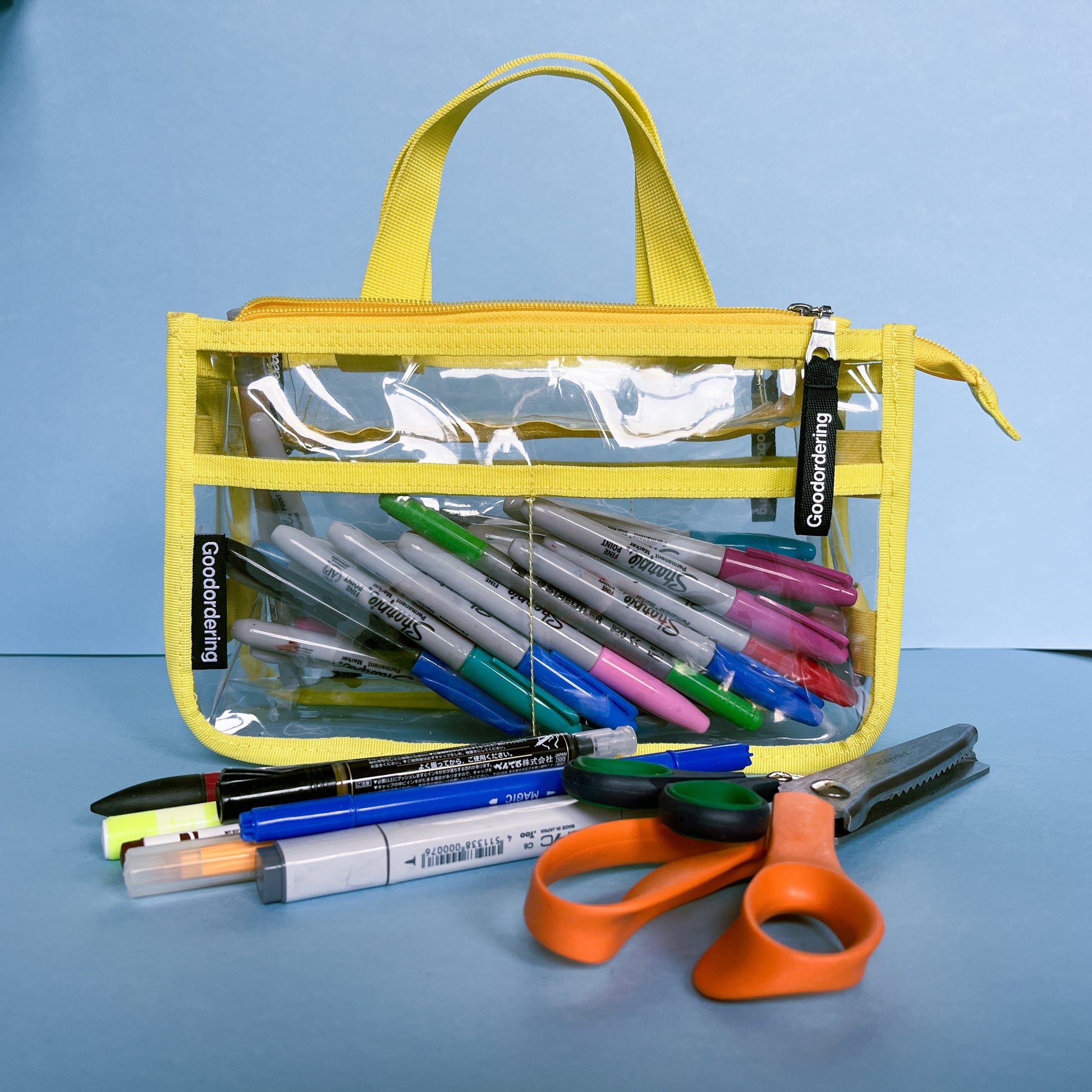 This clear bag organiser was designed with the creative person in mind. Organise all your belongings and move it from bag to bag or attach the adjustable shoulder strap and use it as a hand bag. Use the elastic straps on the side to carry umbrellas or water bottles. Wear it to a concert or gig and never your get your bag checked again! Designed in East London.