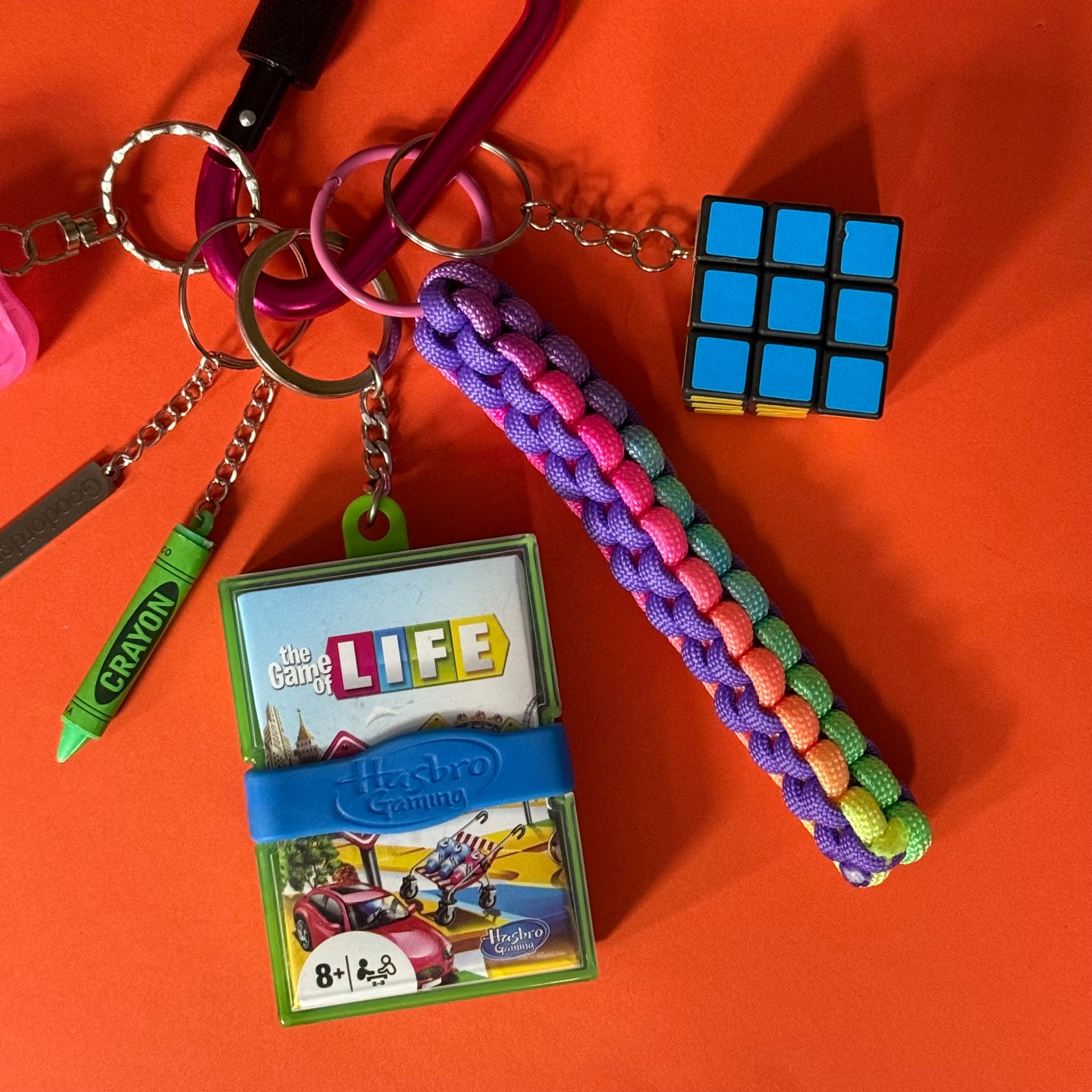 Eclectic bag charm keyring lots of fun elements attached. Including a vintage retro board game miniature. A soft retro vibe of cool primary colours to compliment any bag or outfit. Use together or separate into individual key charms.