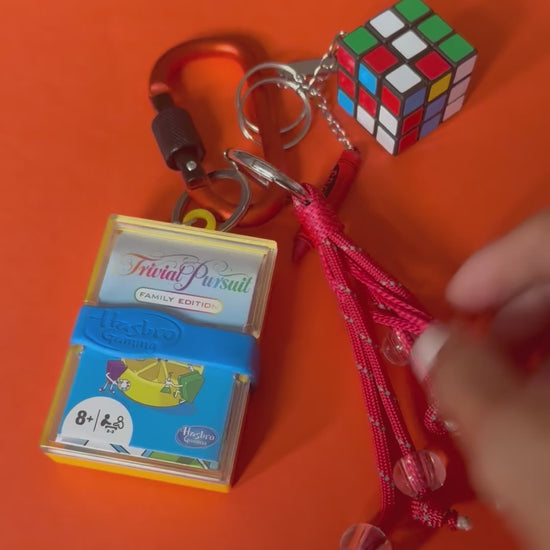 Eclectic bag charm keyring lots of fun elements attached. Including a vintage retro board game miniature. A soft retro vibe of cool primary colours to compliment any bag or outfit. Use together or separate into individual key charms.