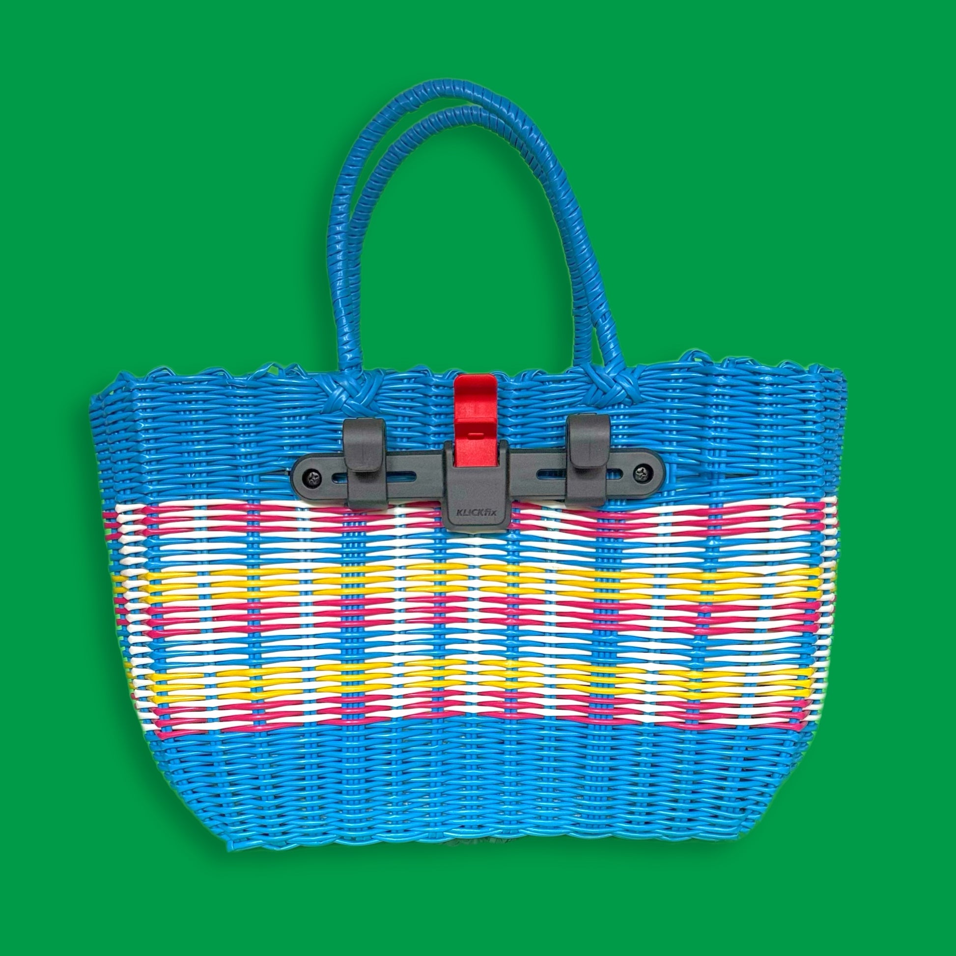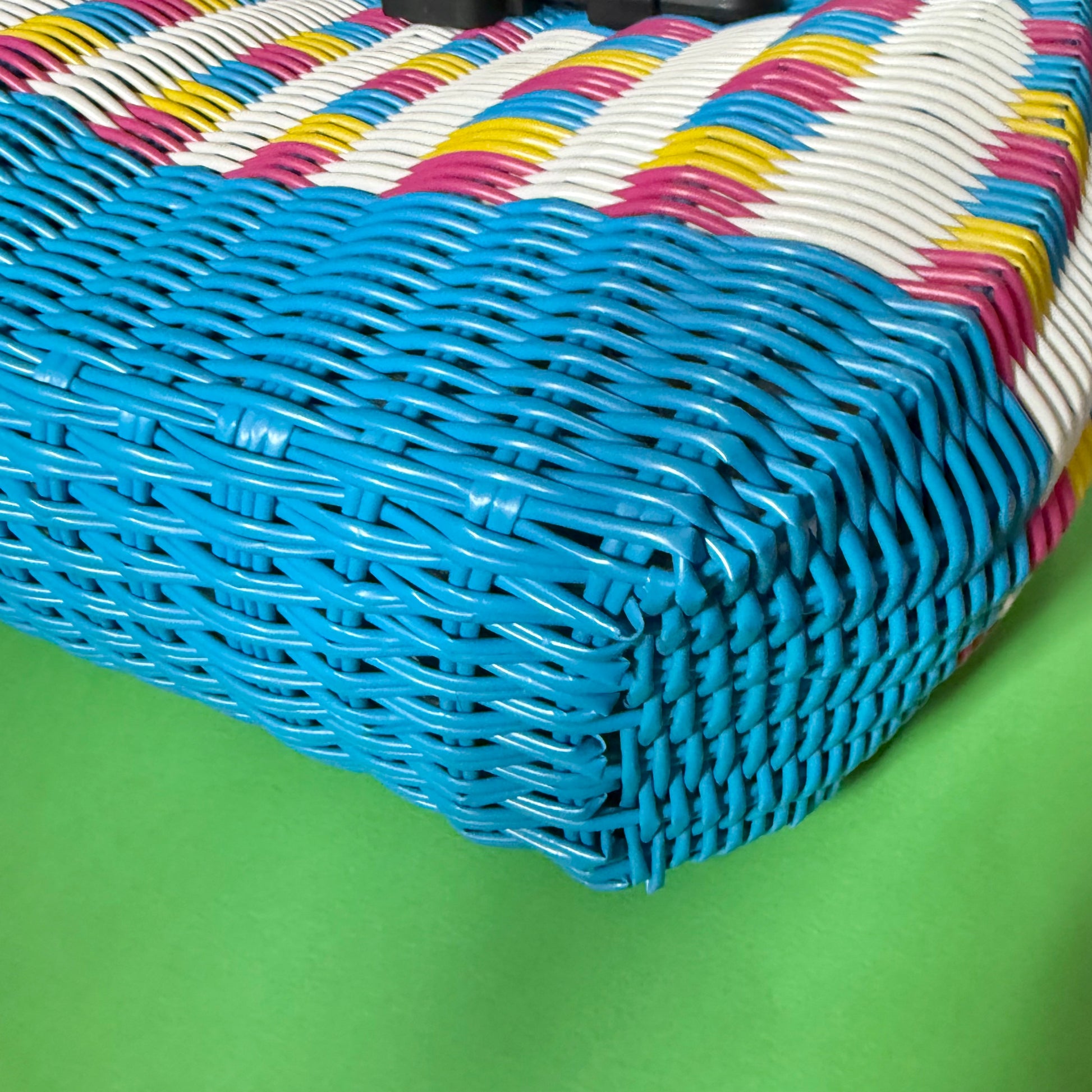 Made from up-cycled woven basket, this bag features double handles and a stiff structure. A perfect basket bag for carrying around voluminous items on your bicycle or to have a basket to easily throw in your shopping without having to remove and re-attach your pannier bag.