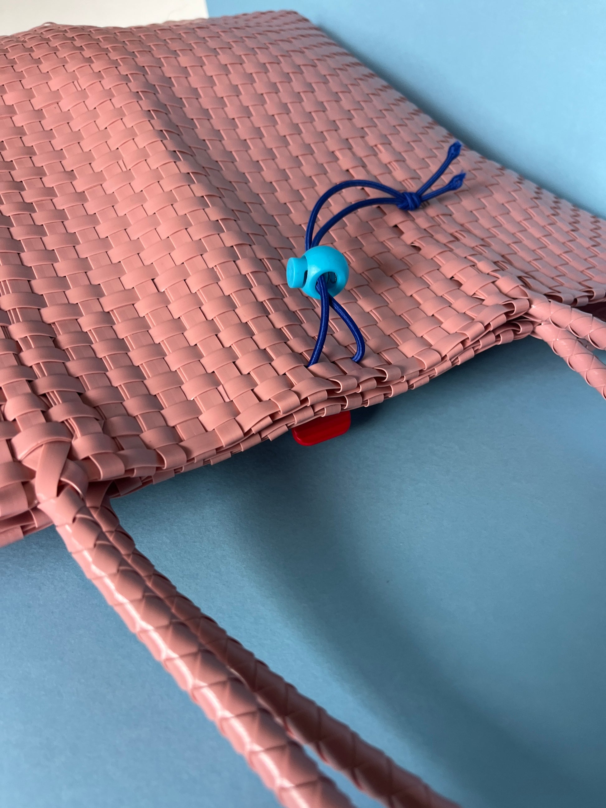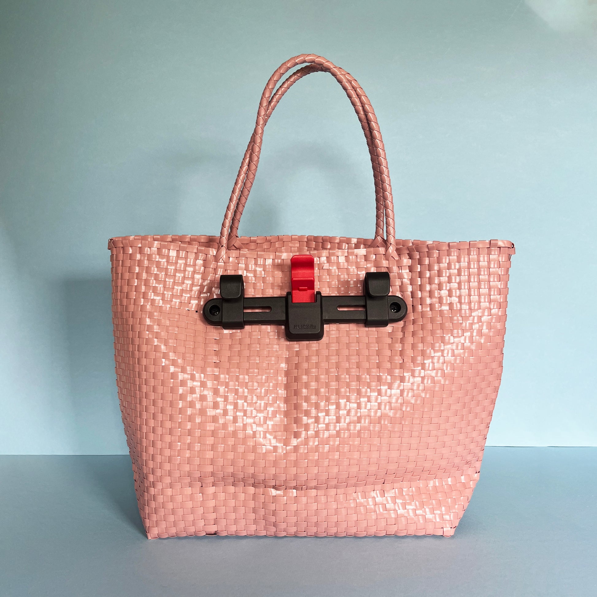 Bicycle Pannier recycled Peach plastic woven basket tote bag with toggle closure