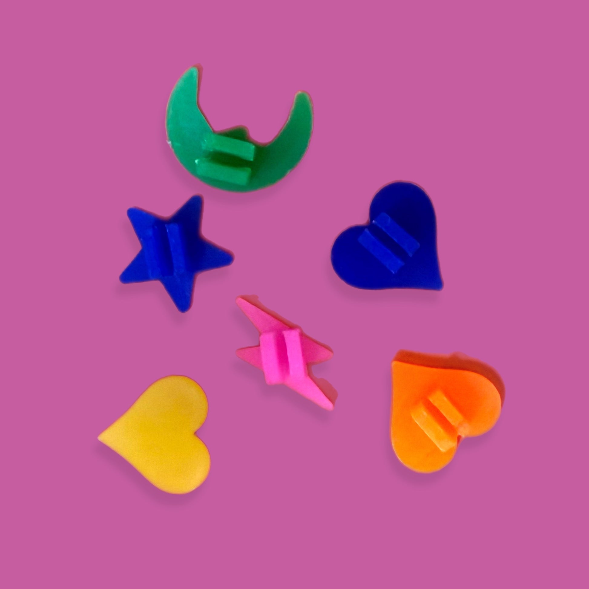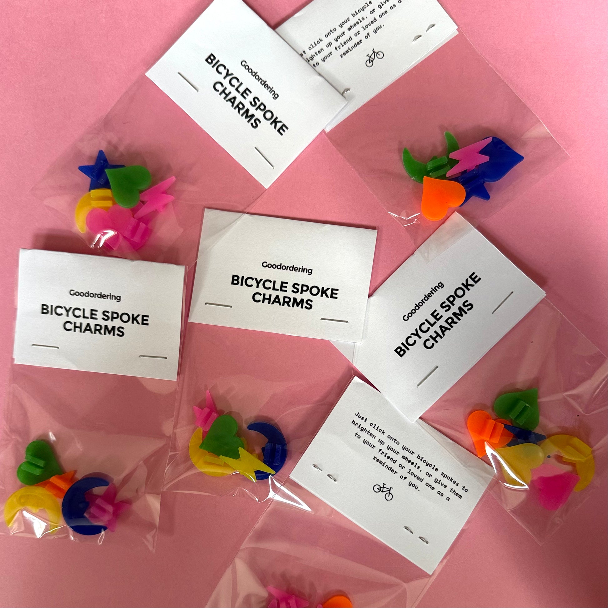 Pack of 5 individual Plastic cute retro bike spoke charms to personalise or customise your bicycle. They clip on simply and easily.