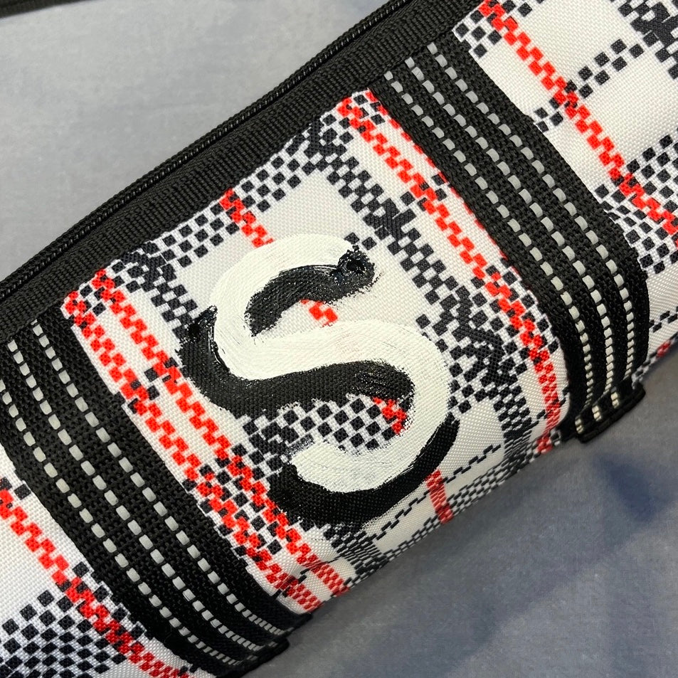 Hand painted lettering with drop shadow. Specify up to 3 letters to be hand painted onto your tartan bag.