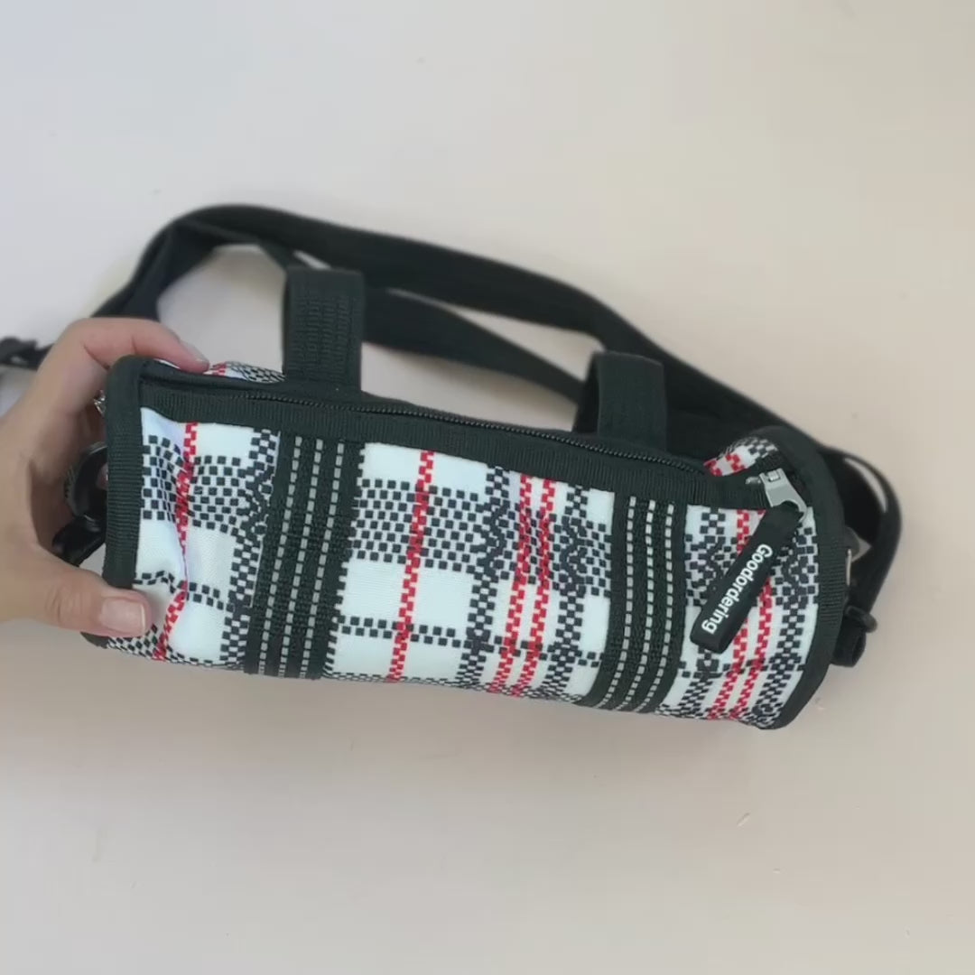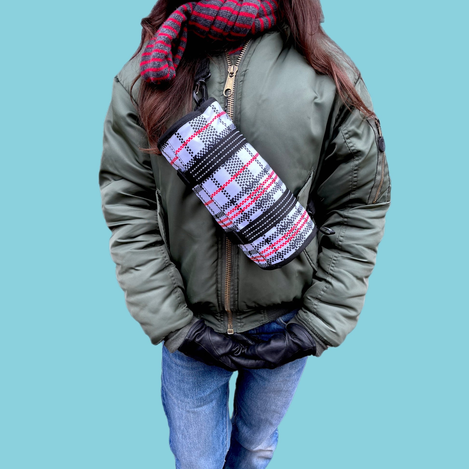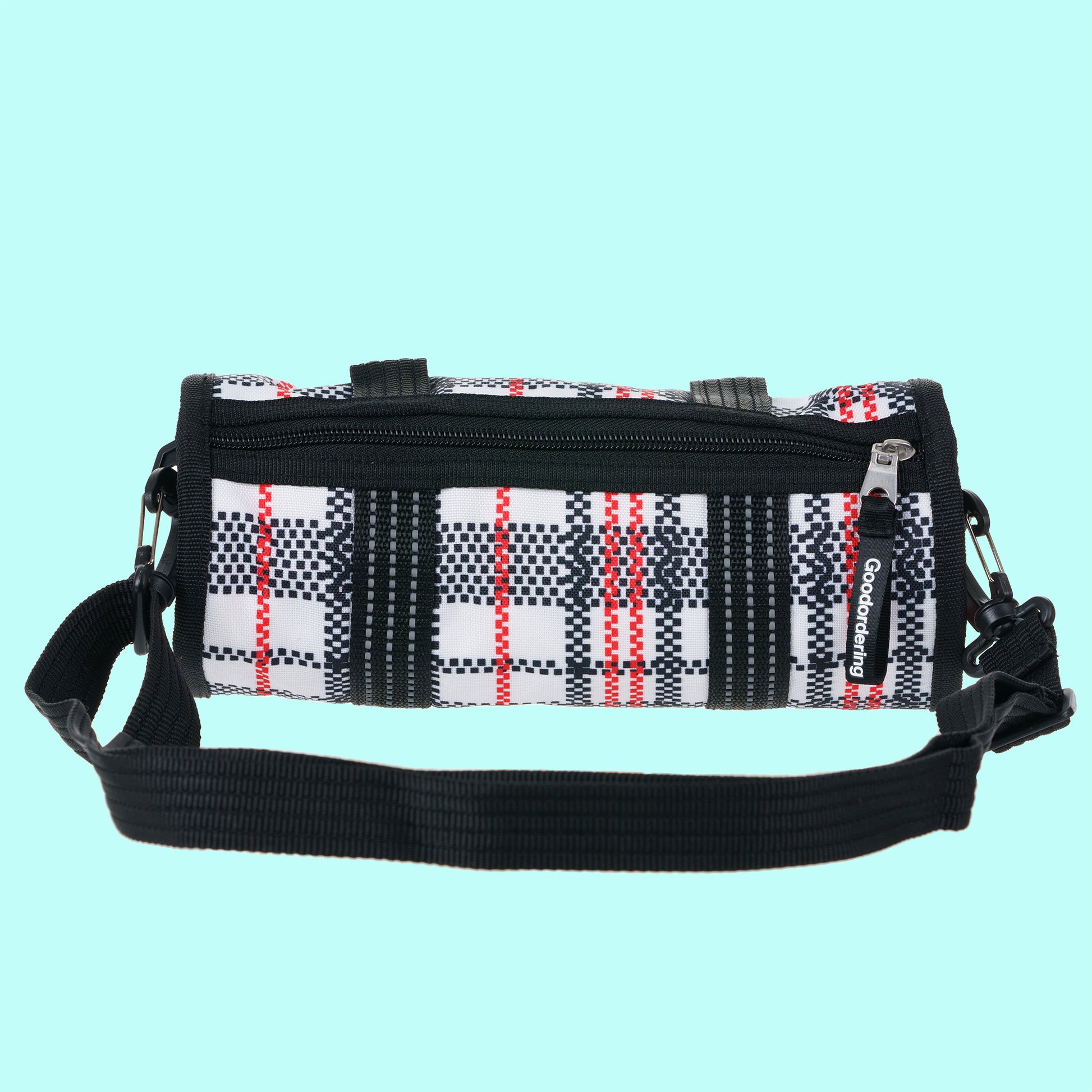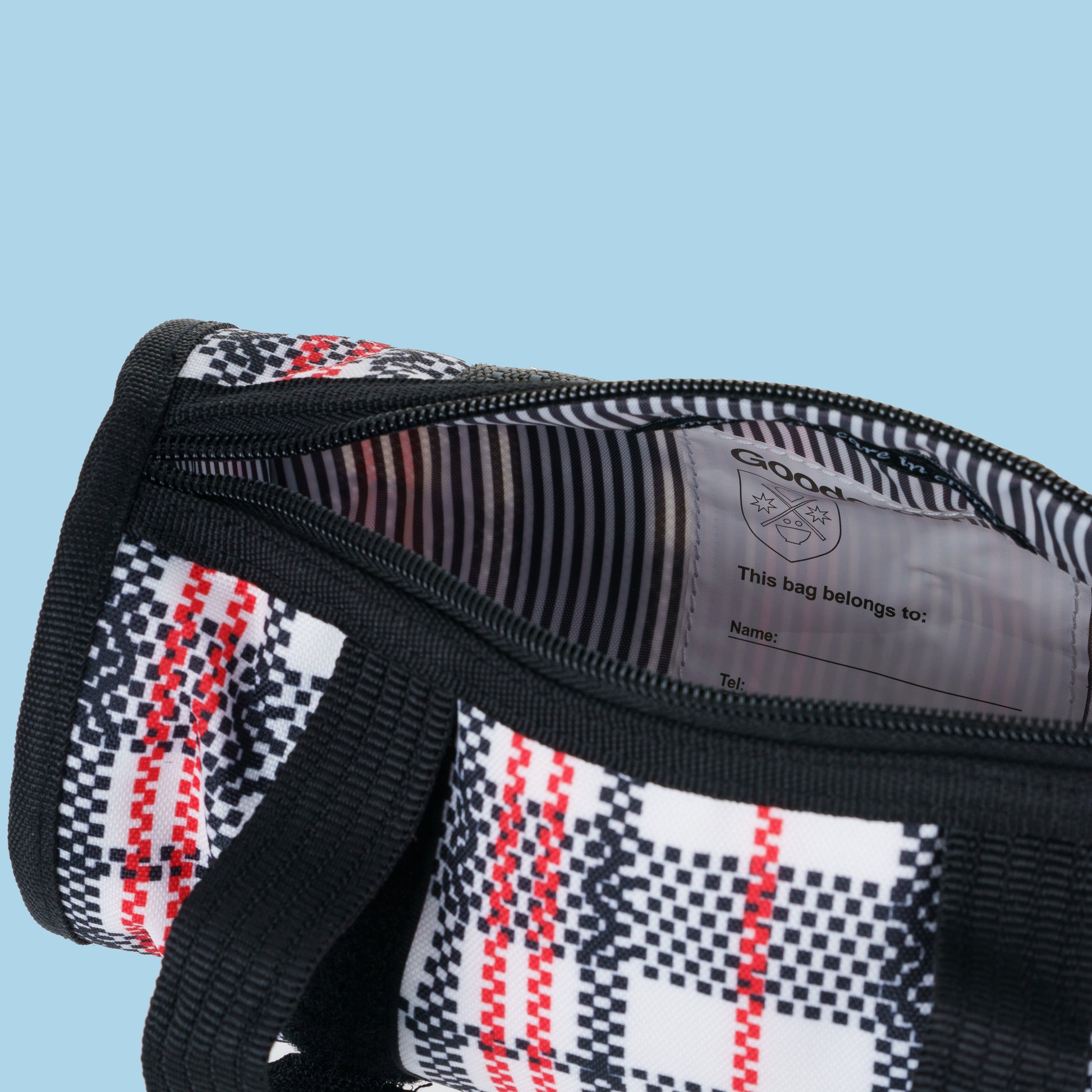 The tartan range was inspired by the iconic laundry bag fabric. Known to everyone all around the world in slightly different guises, a travel bag, a laundry, a moving bag. Widely available and extremely affordable, the laundry bag is bought from any 2 dollar shop / pound store or corner hardware home store around the world. The familiarity of the woven fabric invokes a nostalgic feeling. We have re-invented this fabric for higher durability, converting the woven fabric into a print on a recycled nylon fabric. The result is sustainable and useful for everyday use, but will last a lot longer that the iconic bag that it is inspired by.