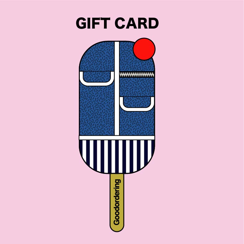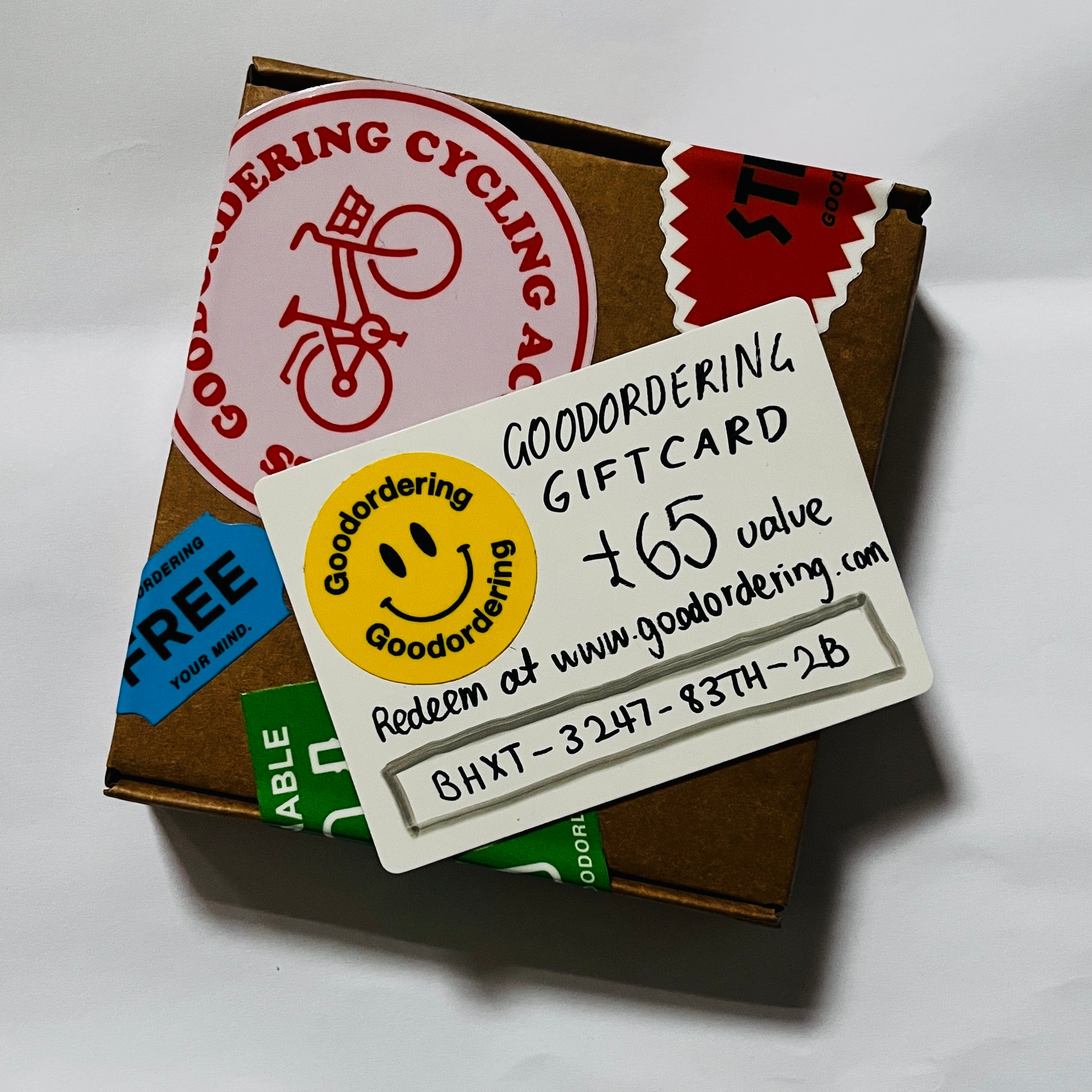 Comes as a card with a unique code to be used on the website inside a cardboard box covered with Goodordering stickers.