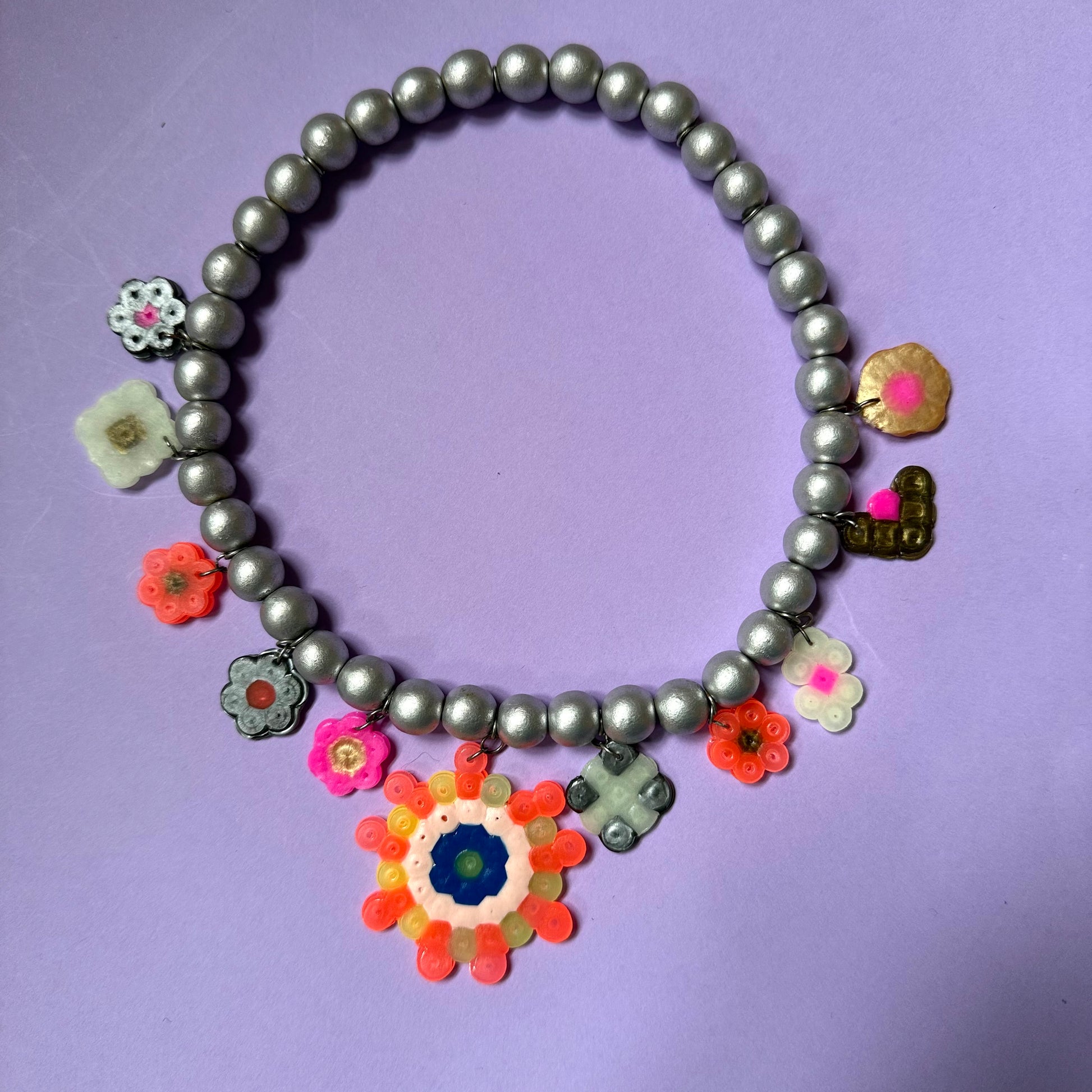 Beaded charm necklace with multiple hama bead charms. Sits flat against chest and very flattering, fun and also high fashion at the same time!