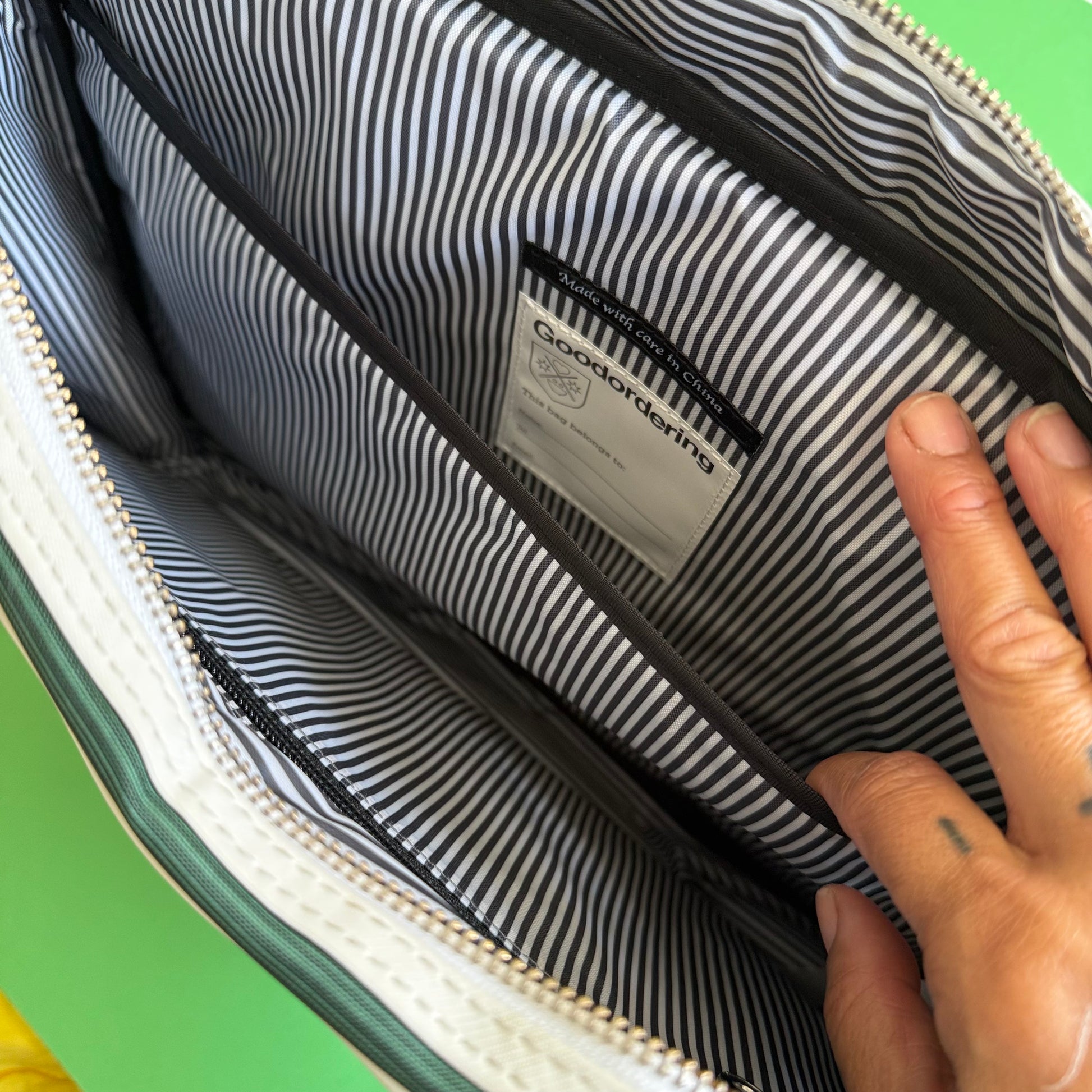 Simply unzip and fold down the compartment on the bag to reveal bicycle pannier clips. Hide this section away easily by closing the zip pocket. Unclip the adjustable shoulder strap to hide it away when the bag is being used as a pannier.