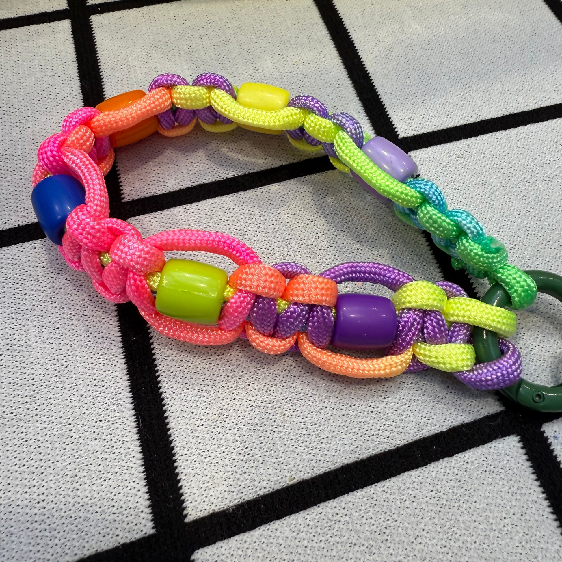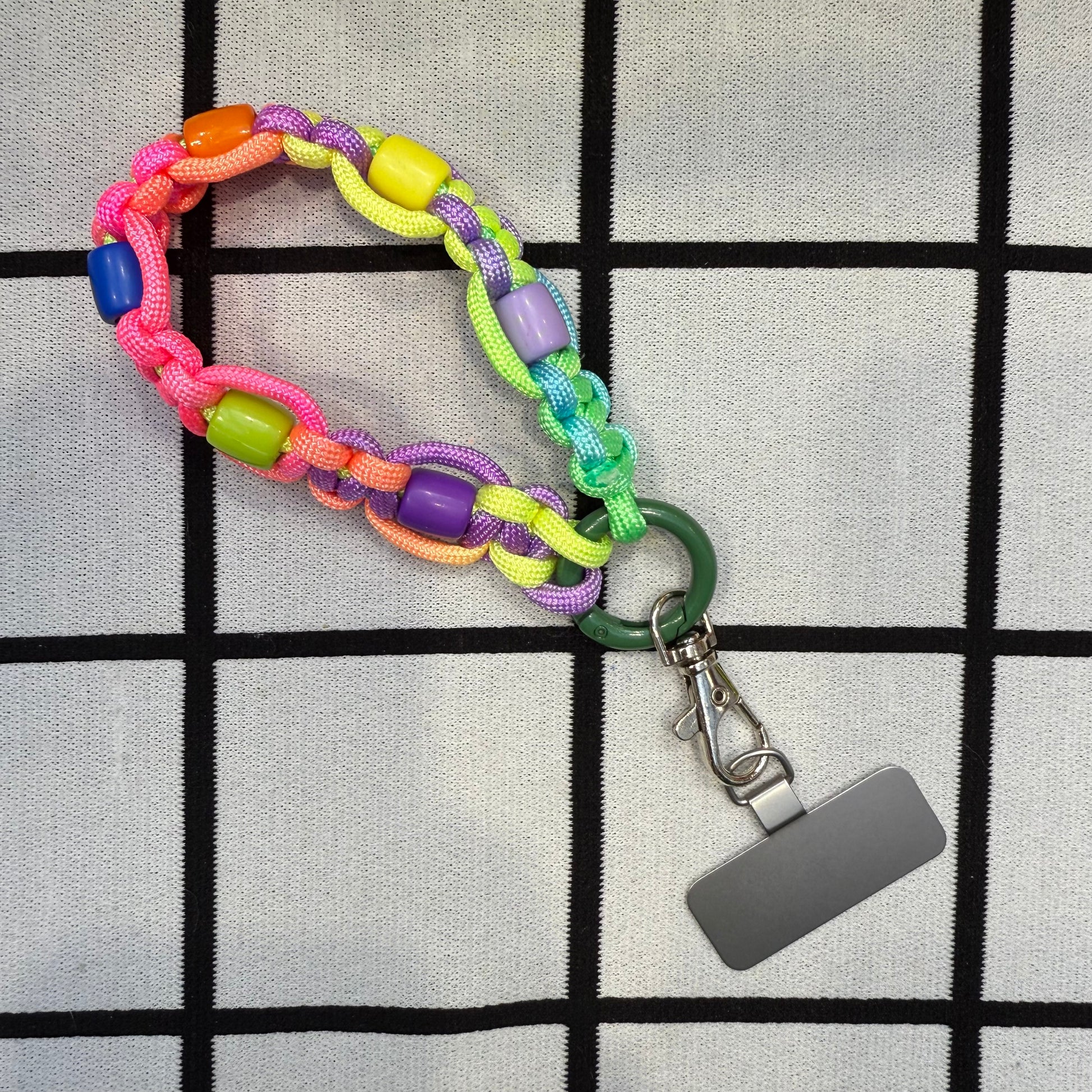 Eclectic bag charm wristlet with multi colour bells, and universal phone holder attachment.