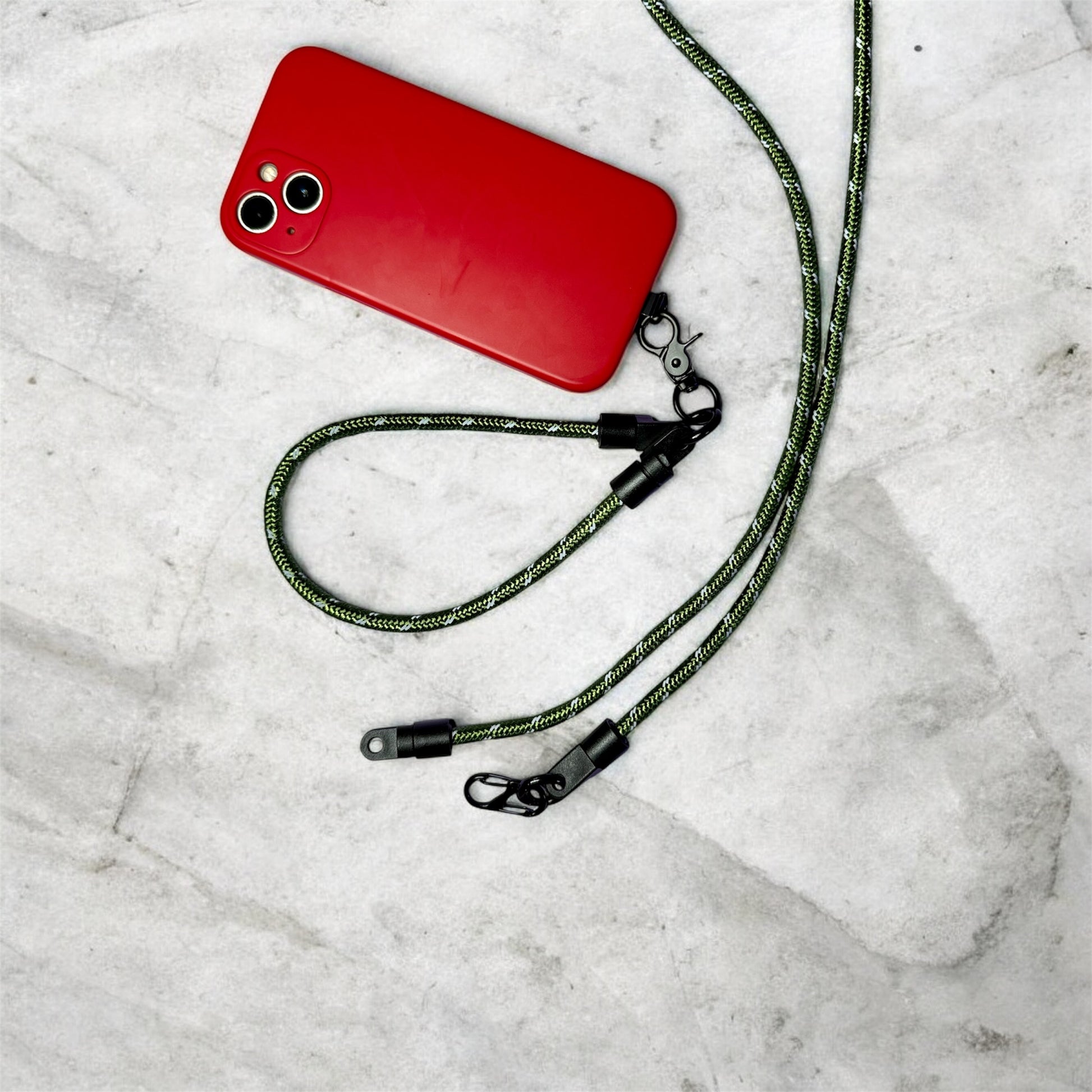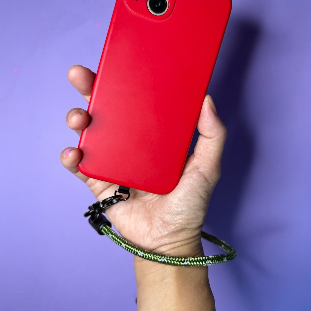 Adjustable 6mm dia paracord phone strap. Flat end goes into your existing phone case and small tab pokes out of charging hole and attached to strap using clip.