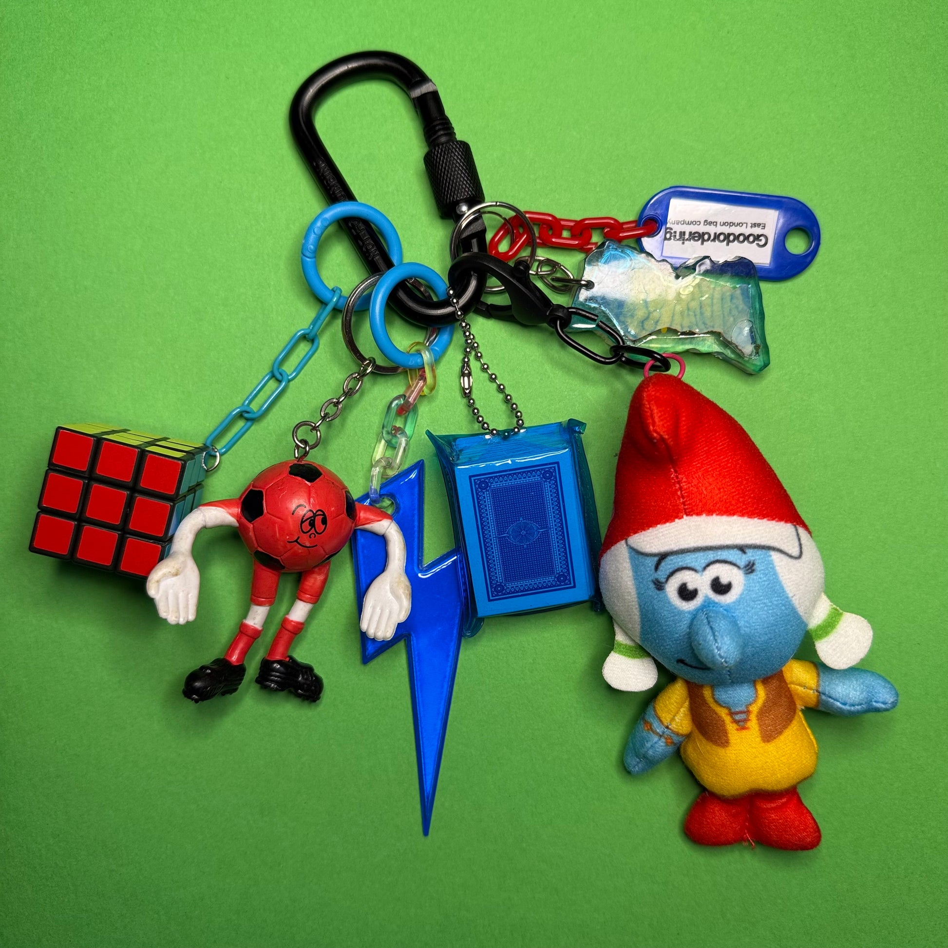 Eclectic bag charm keyring lots of fun elements attached. A soft retro vibe of cool primary colours to compliment any bag or outfit. Use together or separate into individual charms.
