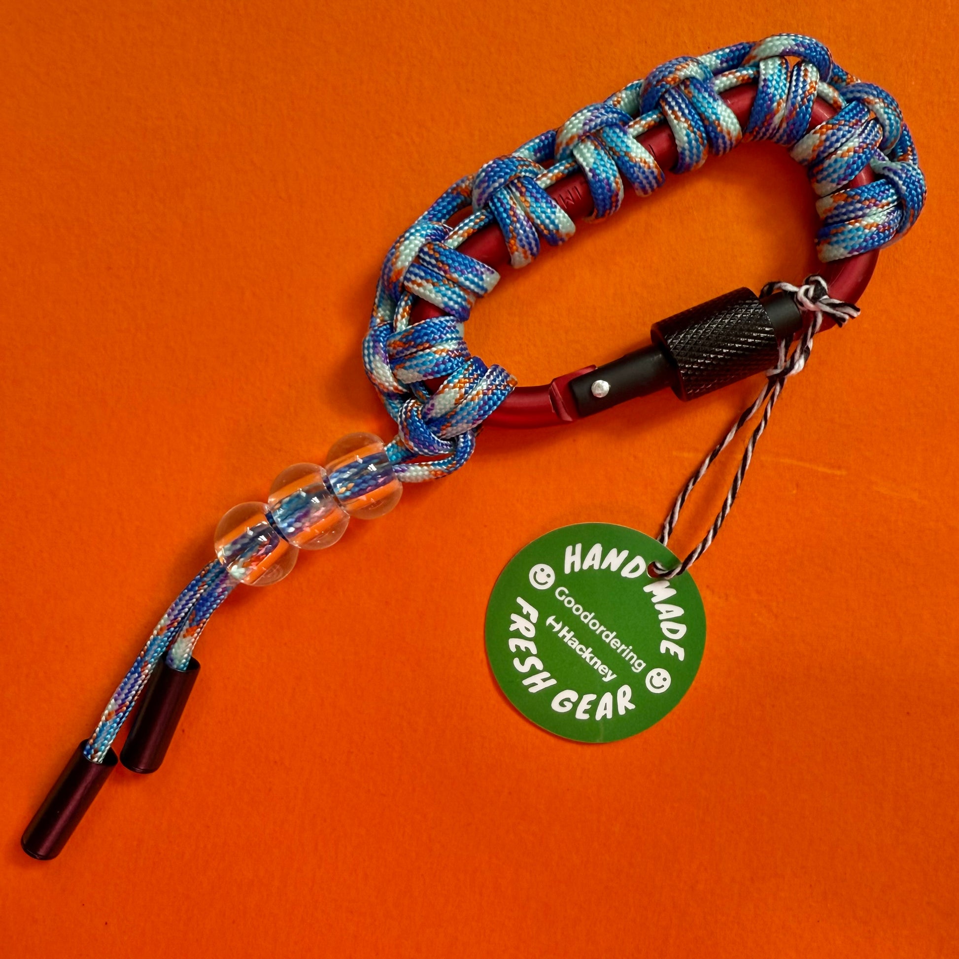 Lightweight aluminium carabiner wrapped with power cord and embellished with beads. Hand made in Hoxton, east london.
