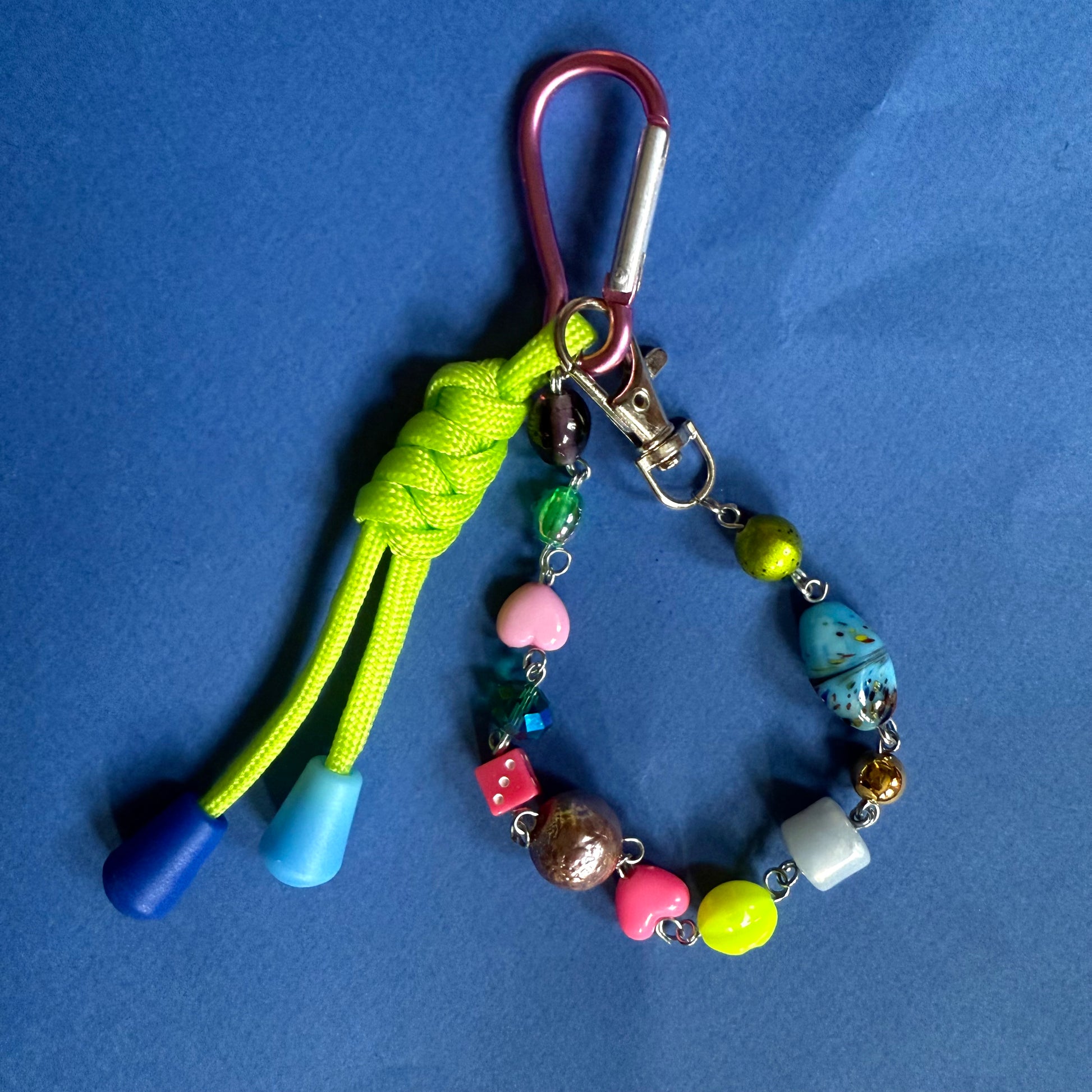 Designed and made in east london with beads and paracord. Use them as a bag charm or keyring or hang from your jeans or skirt.
