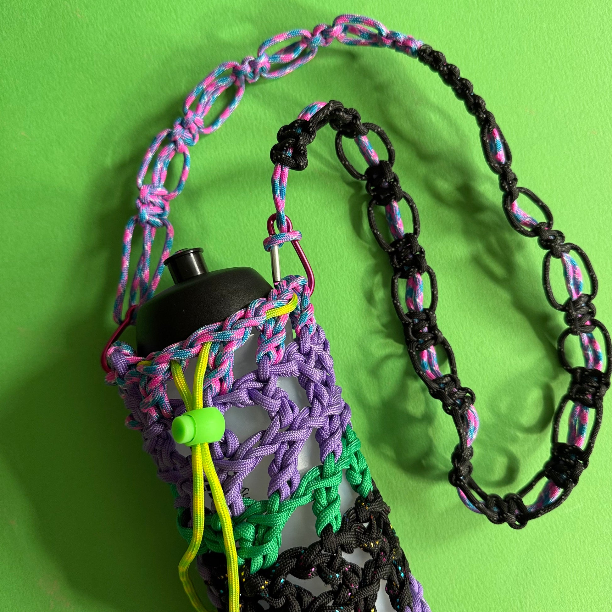 Paracord macrame bottle bag or net bag with tassel detail designed and made in Hackney by Goodordering Jacqui Ma. Neon ombre cord, adjustable in size can fit most water bottles.