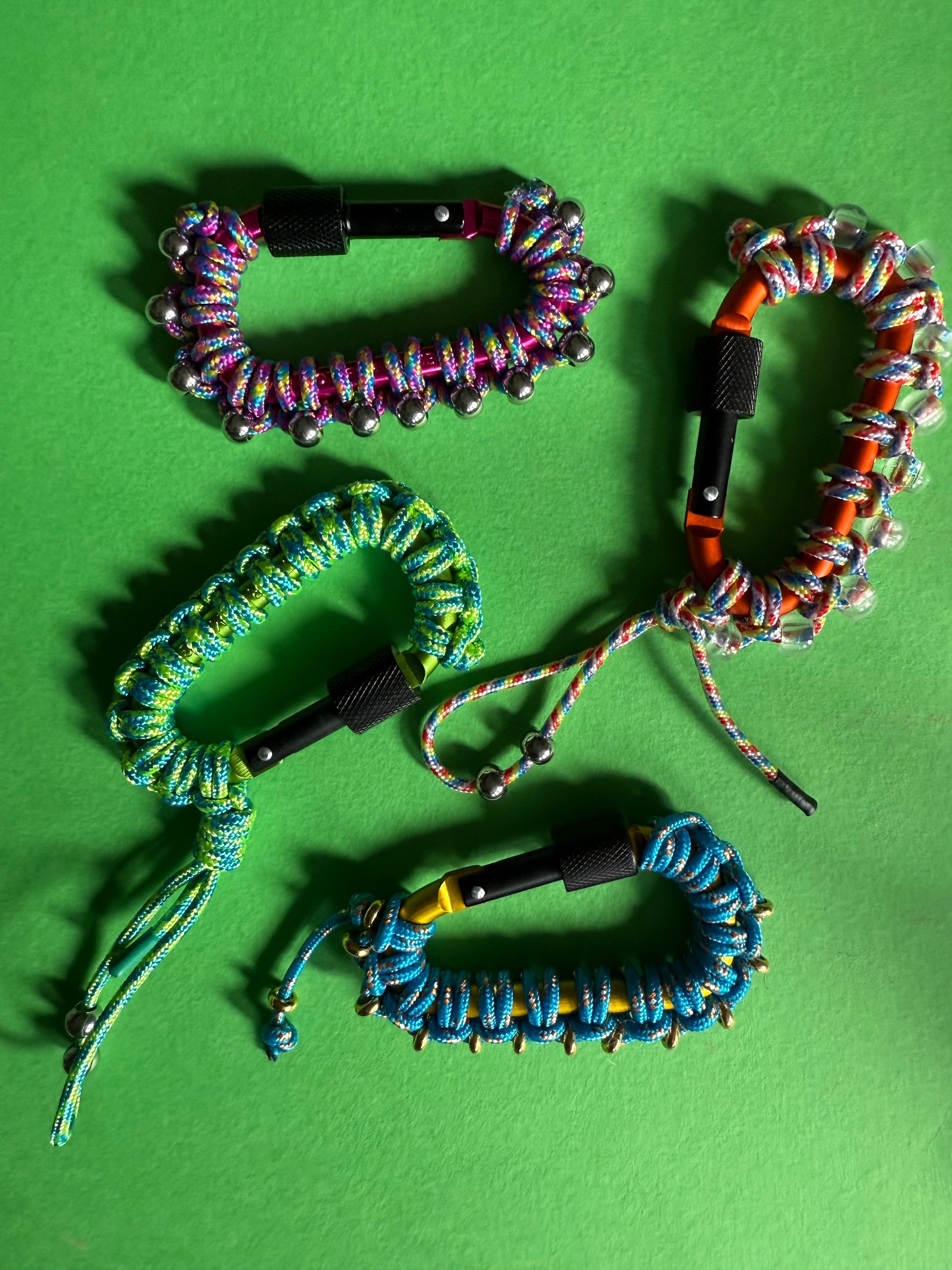 Lightweight aluminium carabiner wrapped with power cord and embellished with beads note the green one does not have beads.