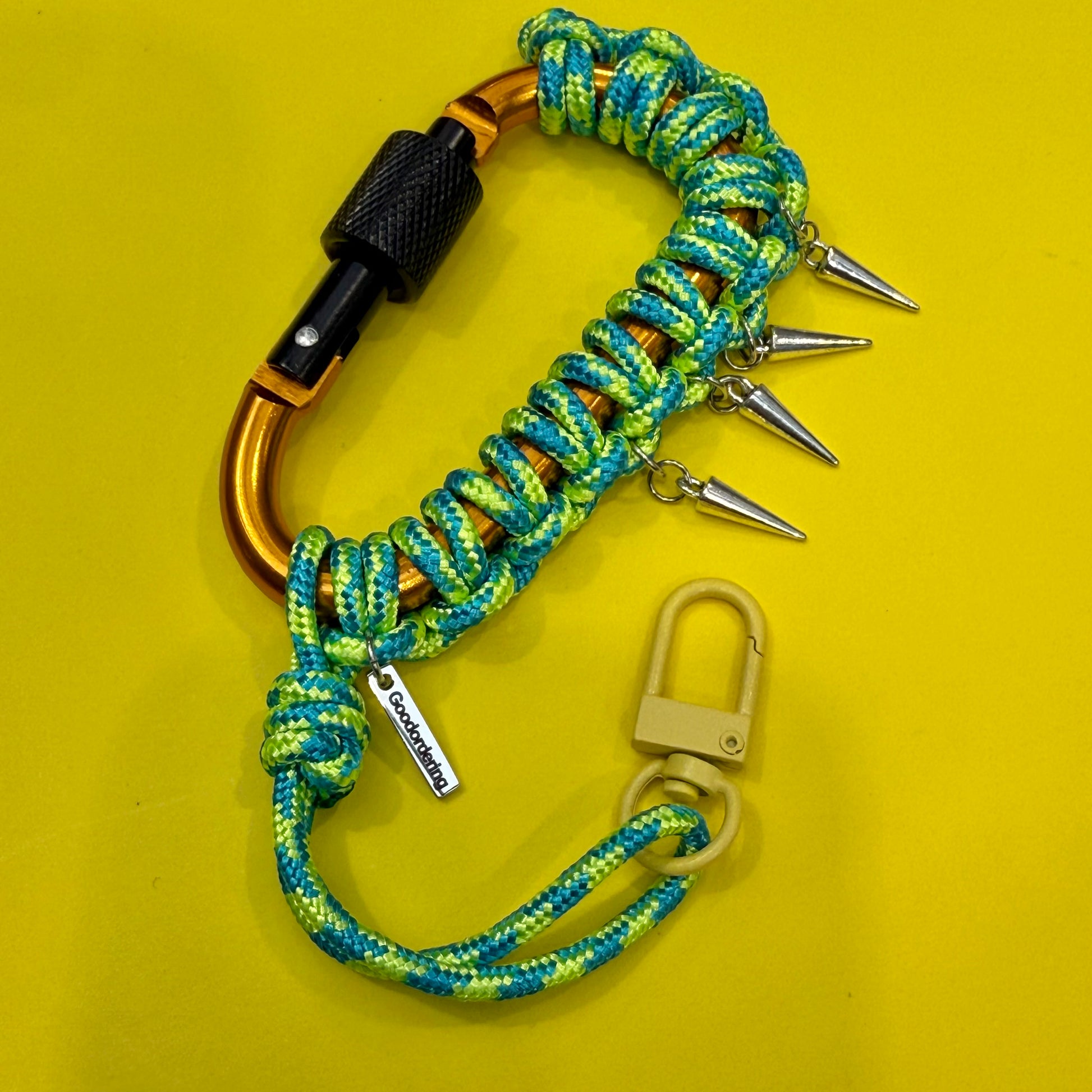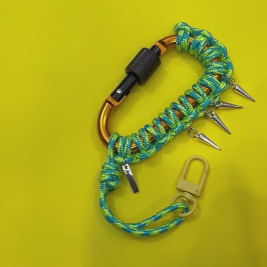 Paracord wrapped carabiner green spikes