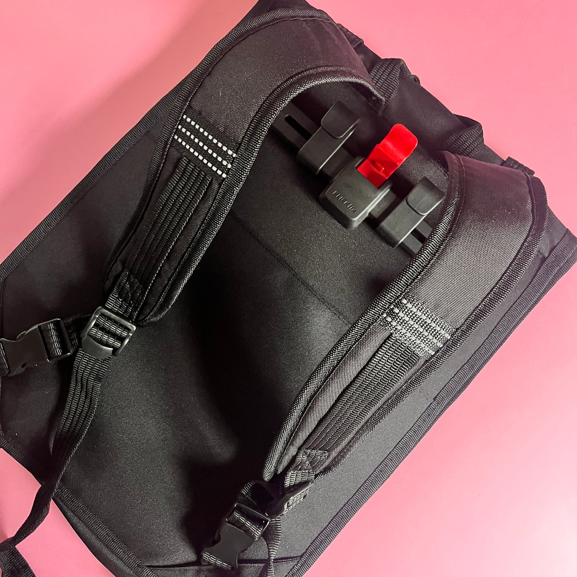 Attaching this bag to a pannier rack can be a little fiddly at first, but bare with it and it will become easier once you have done it a few times . Watch this video to see the best way to tuck away the backpack straps when you attach to your bicycle pannier rack.