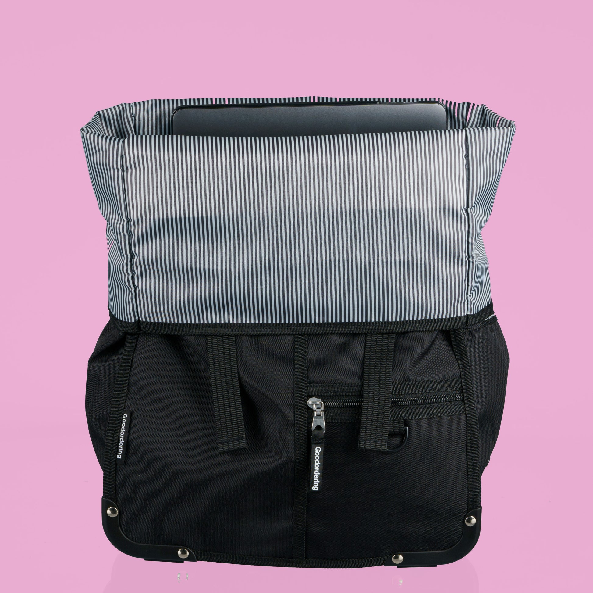 Designed in East London for the commuter cyclist (by a commuter cyclist), the roll top backpack can also be attached to a bicycle pannier rack. This spacious bag is loved by all (cyclists or non-cyclists). It is robust and minimalist but packs in all the functionalities of our classic range, including multiple inside and outside pockets.