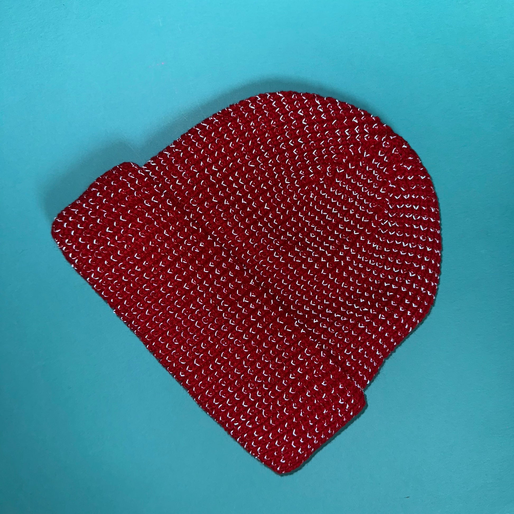 Red knitted beanie with reflective yarn speckles. Perfect for keeping warm but also staying visible on your bicycle.